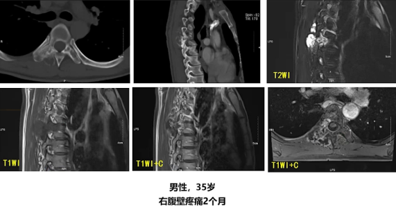 以一例典型的胸椎软骨肉瘤二级为例,胸椎影像显示病变累及椎体及附件,可见骨质破坏。CT显示不规则溶骨性破坏,伴点状钙化及轻度膨胀性骨质改变,整体密度显著不均匀。MRI表现更具特征性,T2像显示等高信号成分呈明显高信号,高信号内见点状低信号提示钙化灶,T1像呈低信号表现。增强扫描显示特征性的分叶状边缘强化,整体呈分叶状强化模式。这种分叶状强化结合钙化灶、T2高信号及轻度骨质膨胀,构成了典型的软骨肉瘤影像特征。