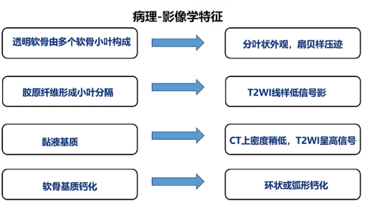 从病理角度看,透明软骨由多个软骨小叶构成,外观呈分叶状。在影像上,胶原纤维形成的小叶分隔在T2像表现为线样低信号。黏液基质在CT上表现为稍低密度,T2像呈明显高信号。软骨基质钙化则表现为环状或弧形钙化。