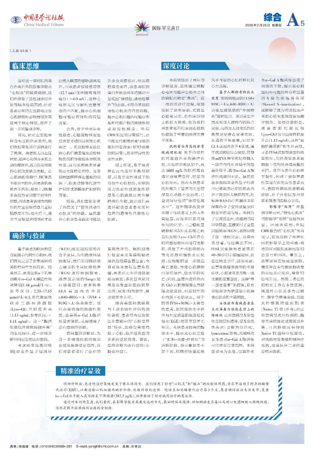 2026年2月28日是第19个国际罕见病日。北京协和医院与《中国医学论坛报》携手推出“罕见病临床思辨”专栏。本文为北京协和医院心内科田庄教授团队带来一例法布雷病(心脏变异型)的曲折诊疗过程。该病例以“单纯高敏肌钙蛋白持续显著升高”为核心表现,曾被误诊为“心肌炎”长达两年,团队凭借“电-解剖分离”线索及精准检测明确诊断并治疗,为临床相关鉴别诊断提供了实践参考。
