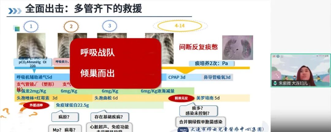 吴医生通过一例1岁11月男童的重症肺炎病例,展现了五重病原体混合感染(耐药肺炎支原体、腺病毒、副流感病毒、鼻病毒、博卡病毒,后期合并铜绿假单胞菌)的诊治挑战。