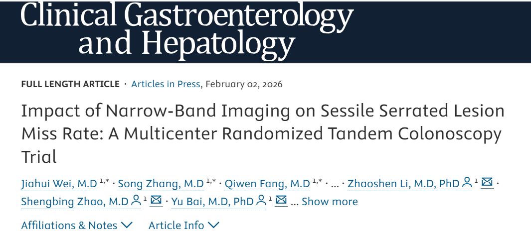 无蒂锯齿状病变(SSL)作为结直肠癌的重要癌前病变,因形态隐匿,不易检出,临床漏诊率较高。既往研究已证实窄带成像技术(NBI)能有效提高结直肠腺瘤检出率,但其对SSL的诊断价值尚不明确。上海长海医院消化内科李兆申院士、柏愚教授团队牵头开展的一项多中心研究,明确揭示了NBI技术在降低SSL漏诊率中的关键作用。研究论文于2026年2月2日在线发表于《临床胃肠病学和肝脏病学》(Clin Gastroenterol Hepatol)杂志。