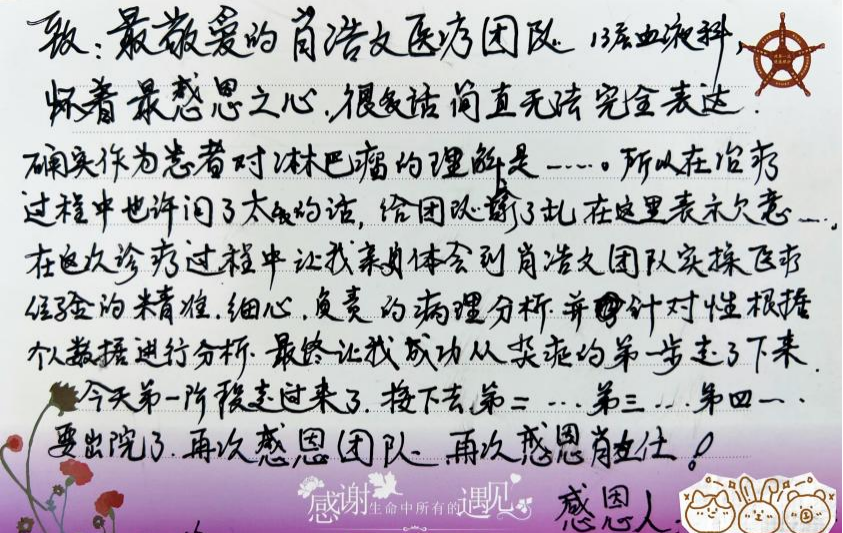 “怀着最感恩之心,很多话简直无法完全表达……”近日,浙江大学医学院附属邵逸夫医院血液内科二/细胞治疗中心肖浩文主任医师团队收到一封来自即将出院的七旬患者亲手交递的感谢信。这份认可,不仅是对医疗技术的肯定,更是对“给您真诚、信心和爱”的服务理念的赞誉。