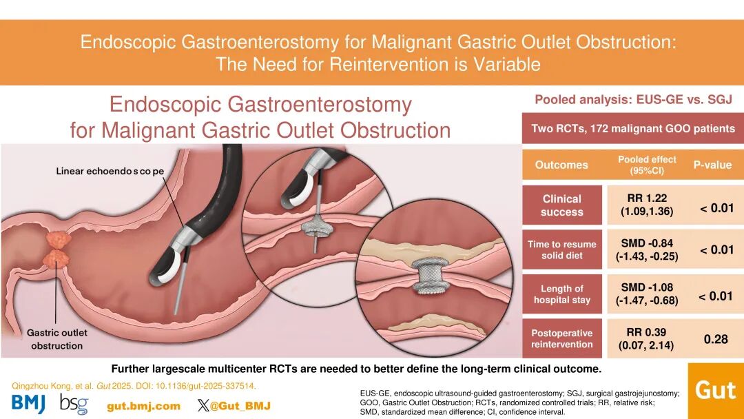 近期发表的两项随机对照试验(RCT)表明,EUS-GE在治疗GOO方面较SGJ具有明显优势,但在因复发性梗阻而需要再次干预这一结局上结果不一致:一项研究显示EUS-GE 可显著降低再次干预发生率,另一项研究则未发现两者存在显著差异。