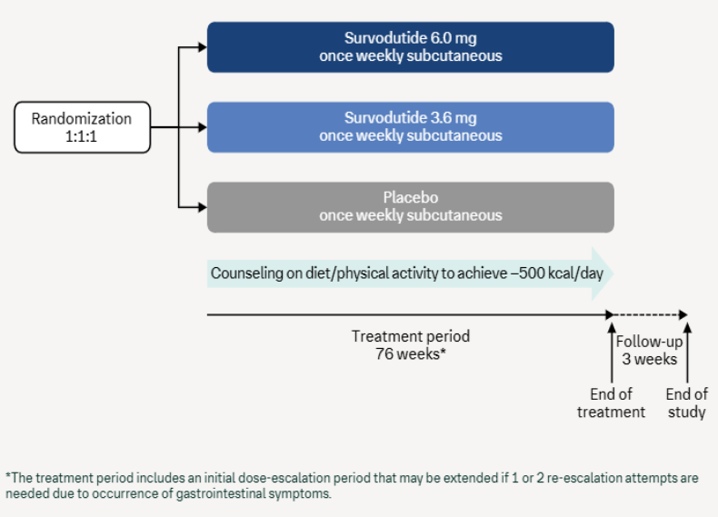 一项在全球14个国家开展的多中心、随机、双盲3期临床试验SYNCHRONIZE-1正在评估Survodutide在超重/肥胖成人患者中的减重疗效、安全性和耐受性。研究纳入身体质量指数(BMI)≥30kg/m2或BMI≥27 kg/m2且合并至少一种肥胖相关并发症的不合并2型糖尿病(T2DM)的患者。入组患者随机分组接受每周一次安慰剂或Survodutide(剂量逐渐增加至3.6 mg或6.0 mg;允许剂量灵活调整),并结合饮食和运动。研究的主要终点为第76周的体重变化百分比以及第76周体重减轻≥5%的患者比例[7]。