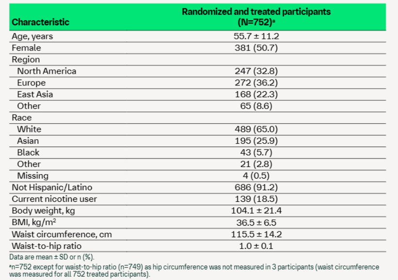 ObesityWeek 2025大会披露了该研究的基线特征(表2)[8]。研究结果显示,752名患者的平均年龄55.7岁,50.7%为女性(n=381),BMI 36.5 kg/m2,体重104.1 kg,腰围115.5 cm, HbA1c 7.4%,收缩压/舒张压为129.8/81.5 mmHg。并发症包括高血压(69.0%;n=519)、血脂异常(67.6%;n=508)、阻塞性睡眠呼吸暂停(17.3%;n=130)、MASH(7.7%;n=58)。合并用药主要包括二甲双胍(78.7%;n=592)、钠-葡萄糖协同转运蛋白2抑制剂(SGLT2i,34.2%;n=257)和降脂药(58.6%;n=441)[8]。进一步疗效/安全性分析预计明年发布。