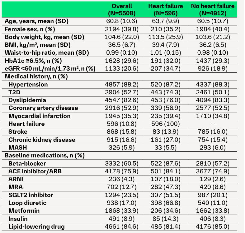 近期举行的AHA 2025大会披露了SYNCHRONIZE-CVOT研究的基线特征(表3)[10]。研究结果显示,随机分组并接受治疗的5508名患者,平均年龄60.8岁,39.8%为女性(n=2194),平均BMI 36.5 kg/m2,596名患者合并心力衰竭,17%的患者有慢性肾脏病,20.6%患者平均估算肾小球滤过率(eGFR) <60 mL/min/1.73 m2。常见的心血管风险因素包括高血压(88.2%)、血脂异常(82.6%)和T2DM(52.7%)。已确诊的CVD包括冠状动脉疾病(53%)、既往心肌梗死(35%)、既往卒中(16%)和心力衰竭(11%)。SYNCHRONIZE-CVOT研究纳入了预先设定的患有心力衰竭的亚组患者。在596名患有心力衰竭(筛选时NYHA分级为II-III级)的受试者中,NT-proBNP中位数为426 pg/ml,堪萨斯城心肌病问卷总症状评分平均值为70.4。基线时,超过一半的心力衰竭患者接受了SGLT2i治疗,66%的患者接受了袢利尿剂治疗。