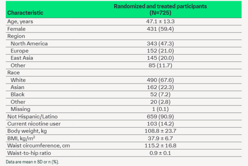 ObesityWeek 2025大会公布了该研究的基线特征(表1)[7]。随机分组并接受治疗的患者(n=725)平均年龄为47.1岁,59.4%为女性(n=431),BMI为37.9 kg/m2,体重为108.8 kg,腰围为115.2 cm。平均糖化血红蛋白(HbA1c)为5.5%,收缩压/舒张压为127.0/82.7 mmHg。大多数患者存在肥胖相关并发症,包括高血压(40.0%;n=290)、血脂异常(33.7%;n=244)、糖尿病前期(30.2%;n=219)、阻塞性睡眠呼吸暂停(18.3%;n=133)、代谢相关脂肪性肝炎(MASH,5.0%;n=36),共有21.8%(n=158)的患者正在服用降脂药物[7]。进一步疗效/安全性分析预计明年发布。