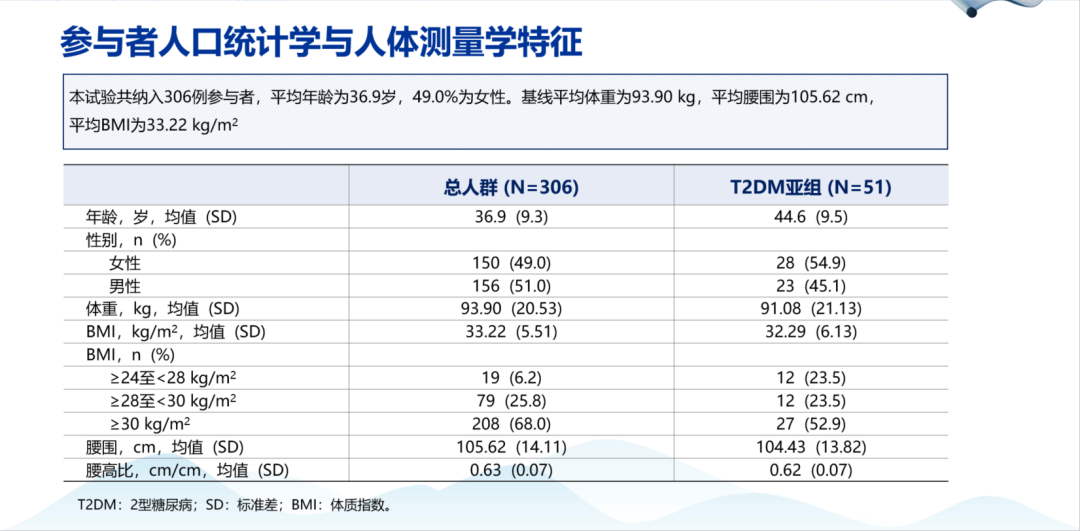 CDS 2025大会公布了该研究的基线特征(图2)[9]。随机分组并接受治疗的患者(n=306)平均年龄为36.9岁,49%为女性(n=150),BMI为33.22 kg/m2,体重为93.9 kg,腰围为105.62 cm,收缩压/舒张压为121.1/82.7 mmHg。大多数患者存在肥胖相关并发症,包括血脂异常(41.5%)、高血压(27.8%)、T2DM(16.7%)、代谢相关脂肪性肝病(9.5%),MASH(5.9%)[9]。进一步疗效/安全性分析预计明年发布。