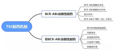 除BCR-ABL依赖性耐药机制外,还包括非依赖性耐药机制如白血病干细胞的天然耐药性、替代性细胞增殖通路的活化维持肿瘤细胞的增殖和抗凋亡等。