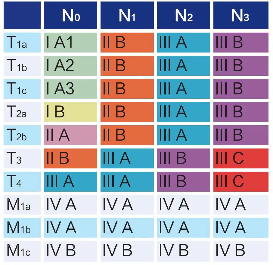 根据T、N、M的不同组合,肺癌又被分为I~Ⅳ期,由罗马数字I、II、III、IV表示;每个期别下又常有细分,见下表。