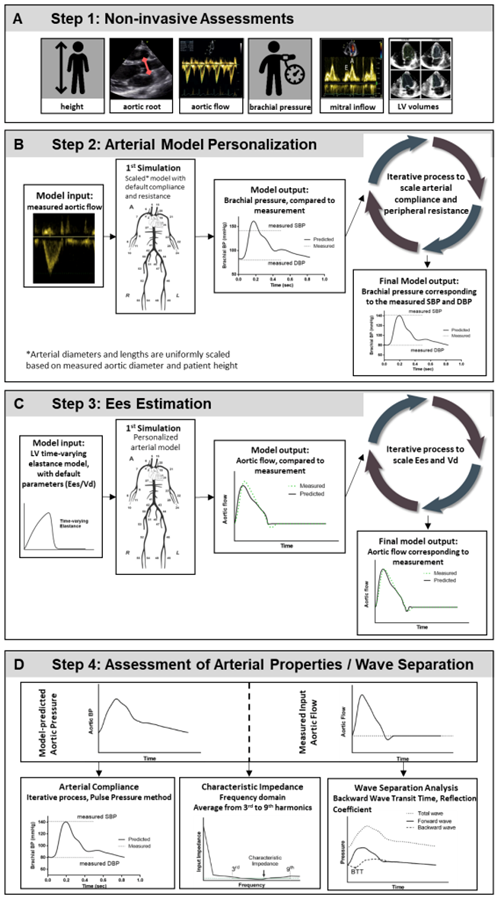 方法:纳入了2015年至2018年间在一个大容量中心接受肾去神经支配治疗难治性高血压的连续60例HFpEF(≥50%)的患者。患者接受去肾神经支配治疗高血压,并在单个中心随访3个月。使用经验证的动脉树计算机模型、无创主动脉流量曲线、左心室容积和E/E′作为输入来确定左心室血管负荷的关键参数(图1)。