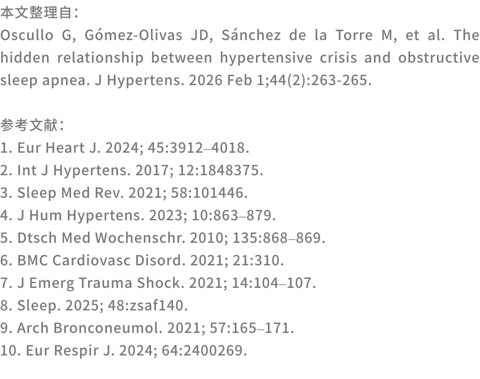 《高血压杂志》(Journal of Hypertension)2026年2月刊发布了一篇述评,探讨了高血压危象与阻塞性睡眠呼吸暂停之间的相关性。