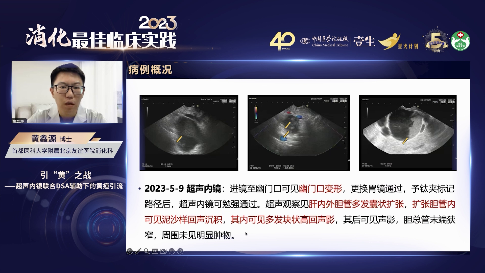 6月,患者皮肤巩膜黄染加重,伴乏力及皮肤瘙痒,再次入院。复查血常规未见明显异常,转氨酶、总胆红素(328 μmol/L,以直接胆红素为主)及反映胆管梗阻的胆管酶明显升高。因患者及家属拒绝外科手术,讨论后选择超声内镜手术解除胆道梗阻。6月8日超声内镜检查发现肝内外胆管明显增宽,在超声下于十二指肠球部用穿刺针穿刺进入扩张胆管,沿胆管置入23厘米改良型胆管引流塑料支架,末端位于十二指肠球部,术后转氨酶和胆红素明显下降,患者症状改善,6月14日出院。