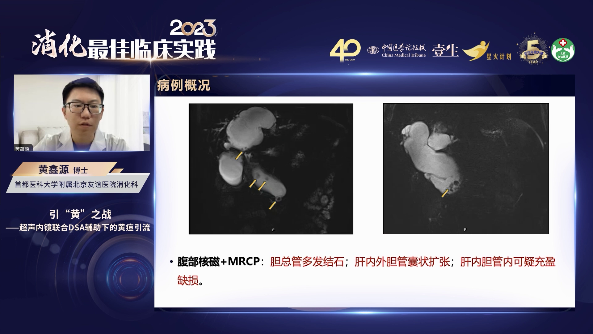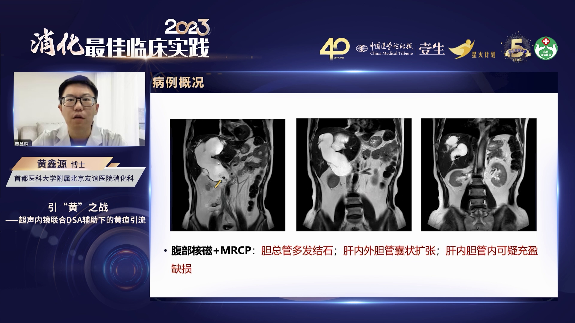 入院后完善检查,患者血象无明显升高,但胆红素显著升高(总胆红素83 μmol/L,以直接胆红素为主),肿瘤标志物及自身免疫检查均阴性。腹盆增强CT显示肝内外胆管明显扩张,胆管内未见明确阳性结石;腹部MRI及MRCP显示肝内胆管多发结石及肝内外胆管囊状扩张,肝内胆管有可疑充盈缺损。