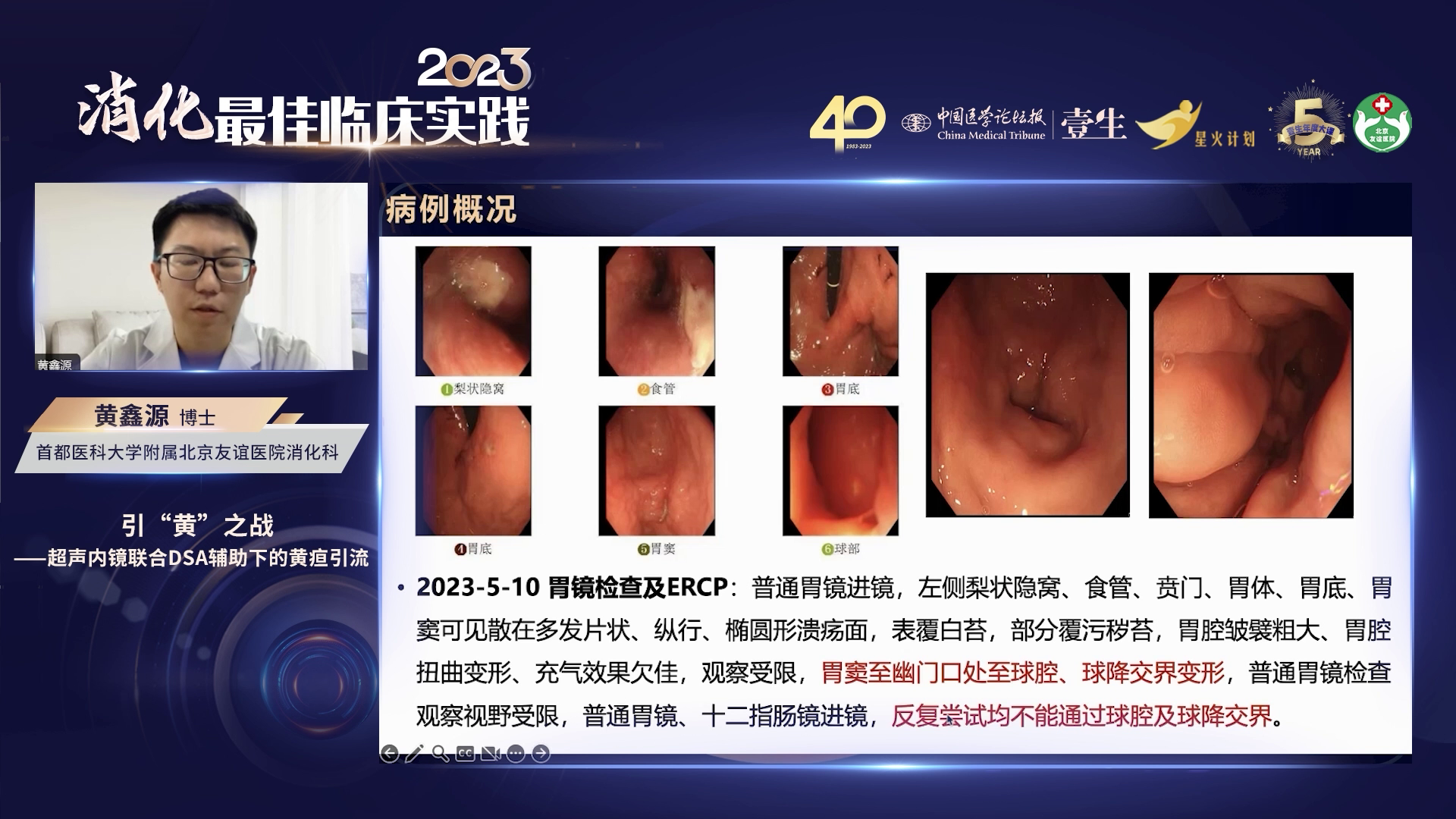 尝试通过ERCP进行胆道引流,但进镜时发现患者幽门口、胃腔明显变形,胃窦至幽门部及球降交界处变形,普通胃镜及十二指肠镜反复尝试均无法通过球部及球降交界处,ERCP失败。向家属交代可尝试超声内镜引导下穿刺引流或外科手术治疗,家属拒绝,患者出院。