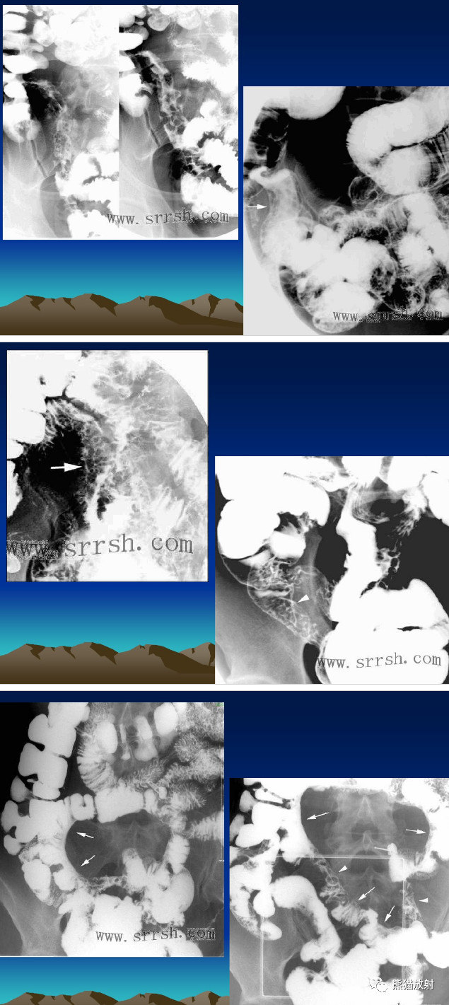 ③肠壁改变:急性期肠壁韧性多无明显改变。慢性期可见肠壁增厚、肠间距增宽、局部蠕动消失以至肠壁僵直,形状固定。