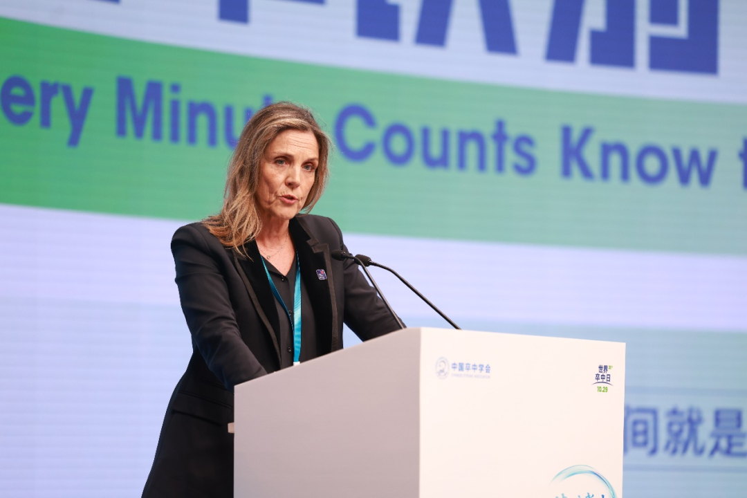 全球卒中行动联盟(GSAC)主席Maria Grupper教授现场致辞,强调卒中已成为全球第三大死因和主要致残原因,而中国在卒中防治领域的创新实践为全球提供了宝贵经验。