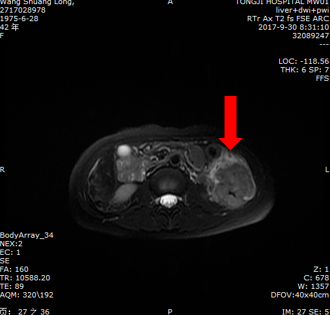 肝脏磁共振平扫+灌注+弥散示:结肠脾曲及降结肠占位,多为肿瘤性病变。