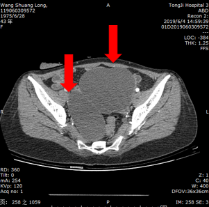盆腔病灶较前明显增大,并出现新发囊性病灶;