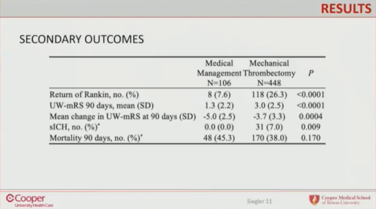 研究的主要终点是功能恢复,定义为发病90天mRS恢复基线水平,即无功能恶化。次要终点包括效用加权mRS(utility weighted mRS, UW-mRS)评分、症状性颅内出血转化、严重残疾或死亡(90天mRS 5~6)。其中,UW-mRS评分沿用自DAWN研究,10.0、9.1、7.6、6.5、3.3、0和0依次对应mRS 0~6 [4]。