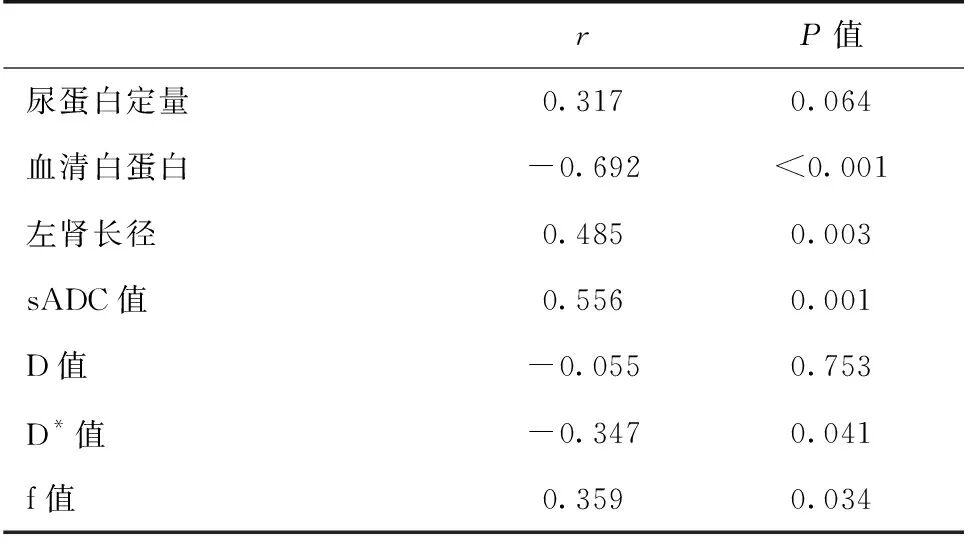 肾间质水肿与临床、影像指标相关性 NS组患者的肾间质水肿程度与血清白蛋白水平呈负相关关系,与左肾长径呈正相关关系;同时,与IVIM序列sADC值呈正相关,与D*值呈负相关(表3)。