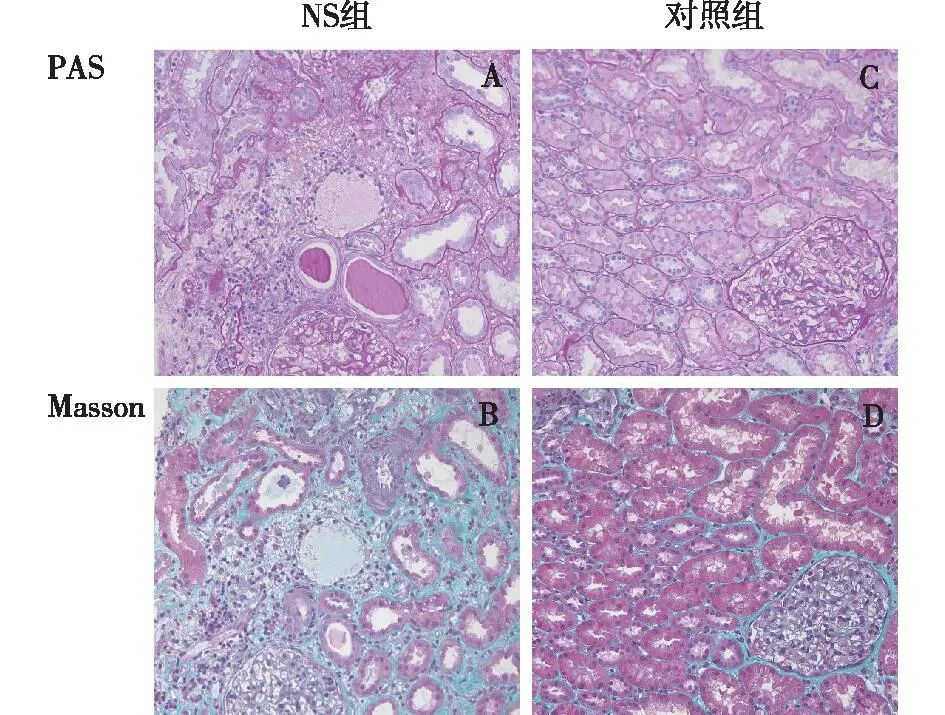 与对照组相比,NS组24 h尿蛋白定量明显升高,血清白蛋白显著降低;左肾长径明显增大;肾组织水肿程度明显升高(P均<0.001)。两组的eGFR、肾小球球性硬化和肾间质纤维化比例无统计学差异(表1)。