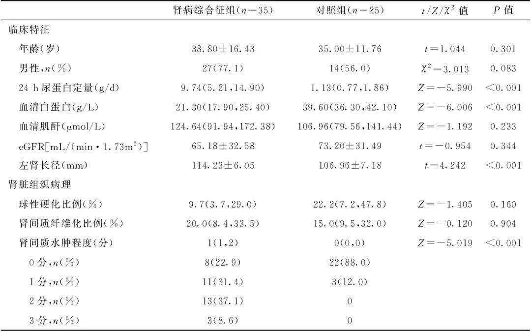 一般情况 最终纳入患者60例,NS组35例(包括FSGS 14例、MCD 8例、MN 13例)和对照组25例。两组患者年龄和性别构成无统计学差异。