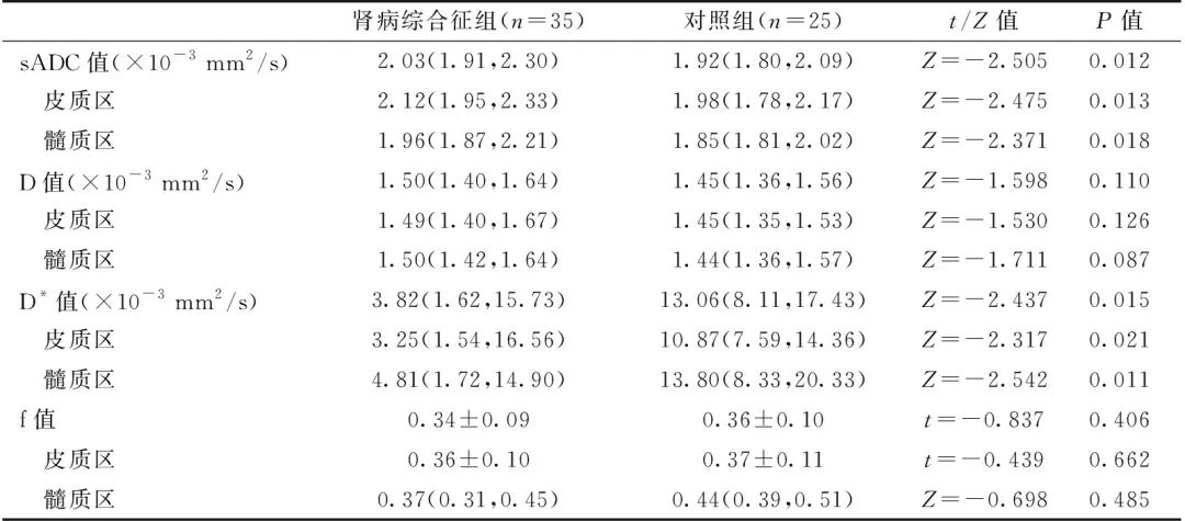 综上所述,NS患者肾组织IVIM-sADC值显著升高,D*值显著降低,提示该类序列参数有望表征NS肾实质的水肿和微循环异常性病变。