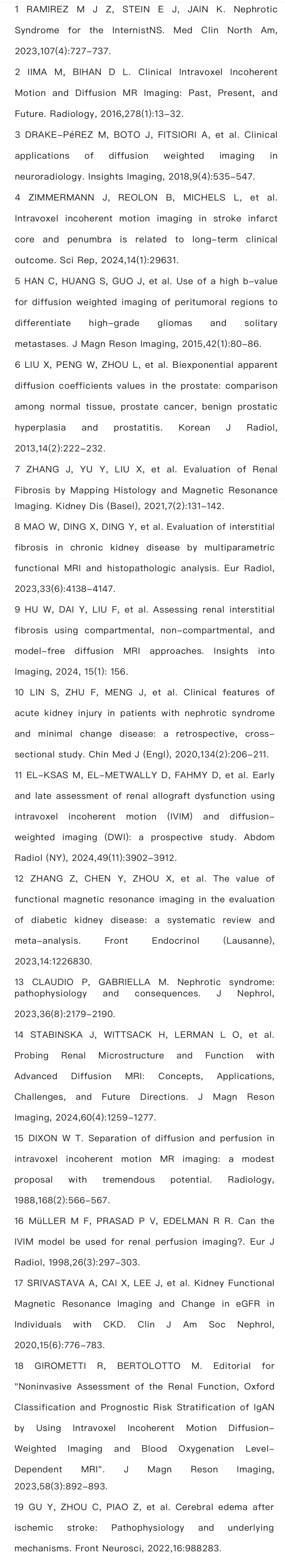 [引用本文]周涵、余雅真、张薇、徐峰、张炯. 功能磁共振体素内不相干运动序列参数与肾病综合征患者肾组织水肿的研究[J]. 肾脏病与透析肾移植杂志, 2025, 34(5): 415-420.