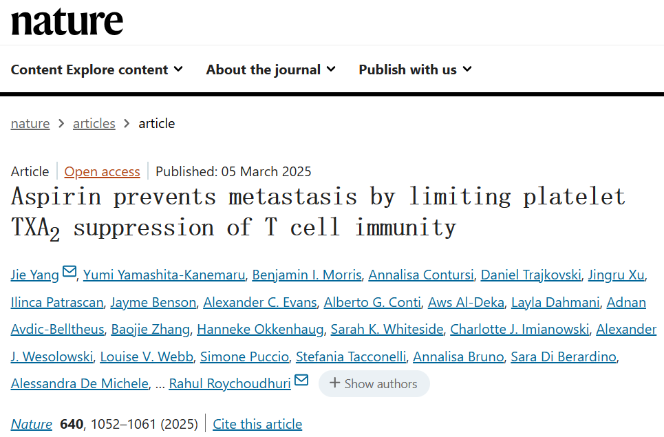 2025年3月发表于《自然》杂志的研究揭示了另一条重要机制:血小板会产生血栓素A2(TXA2) 来抑制T细胞的抗肿瘤免疫。阿司匹林通过抑制TXA2的生成,能够解除这种抑制,从而预防癌症转移。