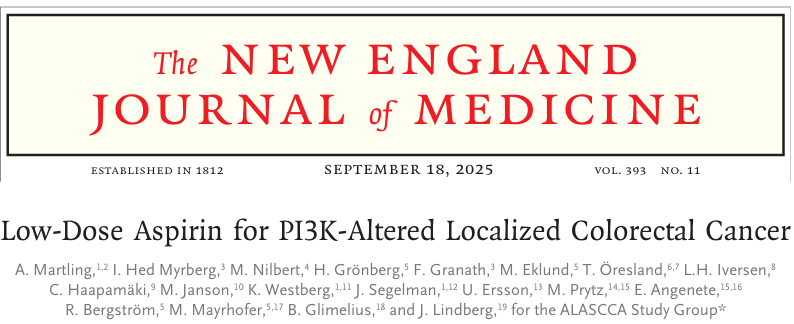尽管有研究证据提示,阿司匹林可能对某些结直肠癌患者有益,尤其是对于携带体细胞 PIK3CA 基因突变的患者,但随机试验的数据一直缺失。瑞典卡罗林斯卡学院研究者在《新英格兰医学杂志》(NEJM)发表的文章填补了这一空白。