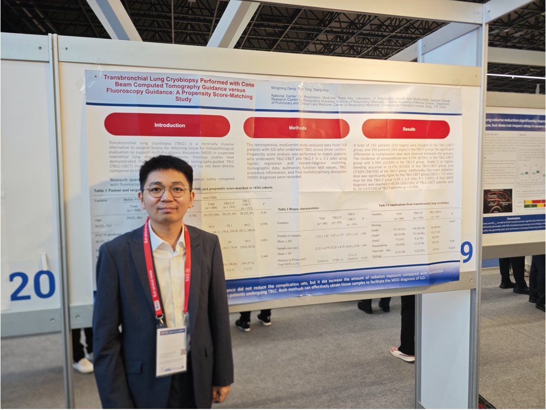 在9月28日8:00(阿姆斯特丹时间)举行的 “Emphysema and chronic bronchitis interventional pulmonology treatment” 学术版块中,邓明明医师作了题为 “Transbronchial Lung Cryobiopsy Performed with Cone Beam Computed Tomography Guidance versus Fluoroscopy Guidance: A Propensity Score-Matching Study” 的壁报交流。
