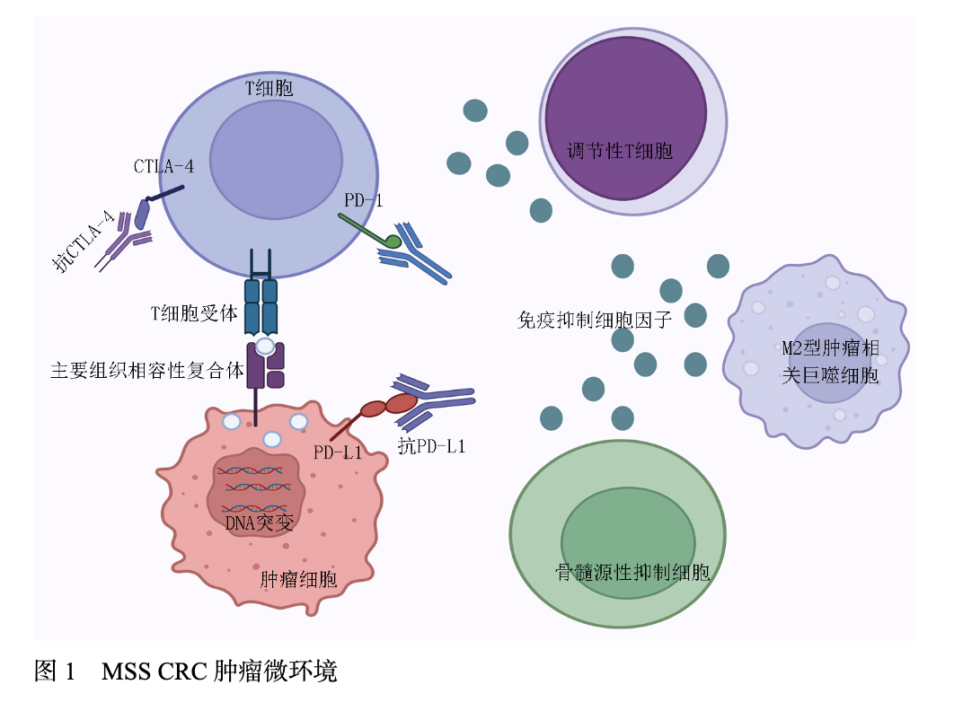肿瘤微环境(tumor microenvironment,TME)是多种细胞类型的复杂组合,除了肿瘤细胞外,还包含基质细胞、免疫细胞及细胞外基质,通过生长因子、趋化因子和细胞因子的交互作用,塑造肿瘤免疫表型并驱动治疗抵抗,是肿瘤治疗耐受、侵袭和转移的关键因素。MSS CRC的TME以免疫抑制性细胞为特征,调节性T细胞(regulatory T cells,Tregs)、M2型肿瘤相关巨噬细胞(tumor associated macrophages,TAMs)及骨髓来源抑制性细胞(myeloid-derived suppressor cells,MDSCs)通过分泌白细胞介素-10(interleukin-10,IL-10)、转化生长因子-β(transforming growth factor beta,TGF-β)等抑制因子,形成免疫耐受网络;而具有抗肿瘤功能的CD8+T细胞、辅助性T细胞1(T helper cell,Th)及M1型肿瘤相关巨噬细胞则显著匮乏,导致免疫监视功能失活。这种细胞组成的失衡与TME的“冷肿瘤”表型密切相关。