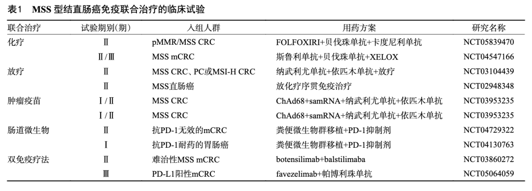 由于ICIs单药治疗只能延长一小部分患者的寿命,研究者们开始探索将PD-1/PD-L1抑制剂与其他免疫疗法相结合的新策略,以提高治疗的响应率和患者的总体生存期。一项随机、开放标签、Ⅱ期研究botensilimab±balstilimaba治疗难治性MSS mCRC的初步结果表明BOT联合BAL的疗效优于BOT单药[34]。Ⅲ期KEYFORM-007研究最终结论表明,相较于标准治疗,favezelimab(LAG3抗体)+帕博利珠单抗未能改善PD-L1阳性pMMR/MSS CRC受试者的OS,同时未观察到新的安全信号[35]。因此,有必要在更多的临床试验中进一步探讨双免疫疗法的疗效及安全性。