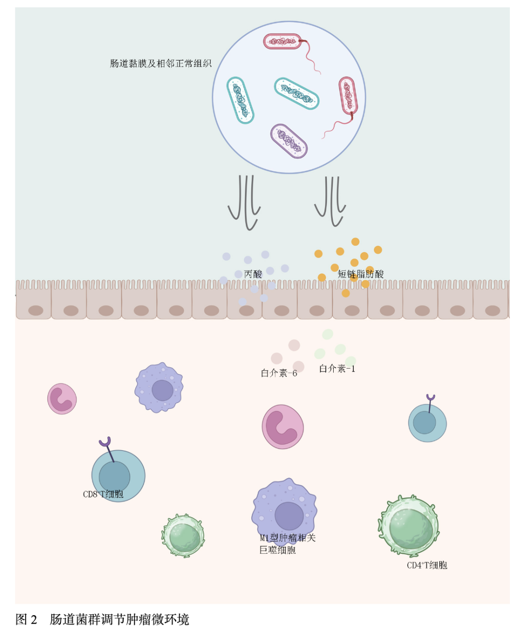 肠道菌群的状态、多样性和代谢产物可以直接或间接地与肿瘤细胞相互作用,影响肿瘤细胞的增殖和凋亡,并调节宿主的免疫反应和炎症状态。dMMR和pMMR肿瘤患者肠道微生物群及多样性存在显著差异性。Jin等[25]发现,与MSS CRC相比,MSI CRC具有更高的微生物丰富度和明显的组成差异。值得注意的是,MSI CRC患者明显存在梭杆菌、阿克曼菌、双歧杆菌等其他物种,这些益生菌的富集可增强CD8+T细胞在TME中的聚集,并提高ICIs的疗效;在微生物代谢组学研究中,大量益生菌的丰富度与毒性代谢产物(包括丙酸和丁酸酯)的浓度呈正相关,这些代谢物可以进一步增强免疫细胞活性和浸润。存在于pMMR CRC患者中的具核梭菌通过增加肿瘤微环境内MDSCs和TAMs的数量对肿瘤特异性免疫反应产生负面影响,从而降低ICIs治疗的疗效[26]。有益菌产生的代谢物-短链脂肪酸在dMMR CRC中显著富集,并通过上调主要组织相容性复合体I类和IL-6、IL-1等趋化因子诱导CRC细胞DNA损伤,从而激活细胞毒性CD8+T细胞和DC,增强免疫疗效[27]。肠道菌群调节肿瘤微环境机制汇总见图2。