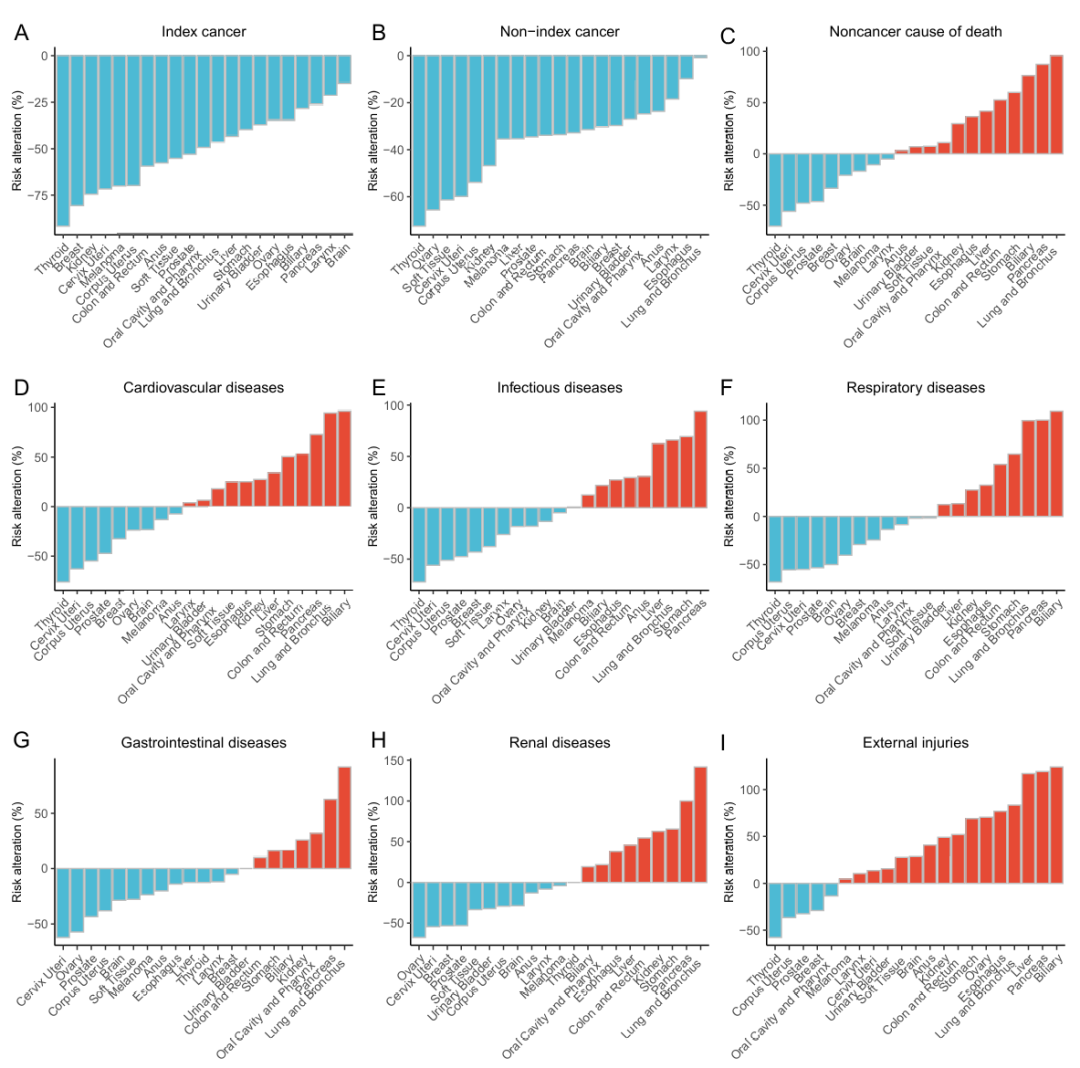研究首次明确,在21种实体癌中的14种(包括前列腺癌、乳腺癌、结直肠癌、甲状腺癌等)癌症患者术后,非肿瘤原因死亡已超过原发病灶相关死亡,占术后总死亡的48.7%。其中,心血管疾病和感染是最主要的因素,这与抗肿瘤治疗(化疗、放疗、靶向治疗等)可能引发的心血管毒性、免疫功能抑制密切相关。进入2020年代,非肿瘤因素已正式成为这些癌症患者术后的首要死亡驱动因素,彻底改写了“癌相关因素是术后主要死因”的传统认知。