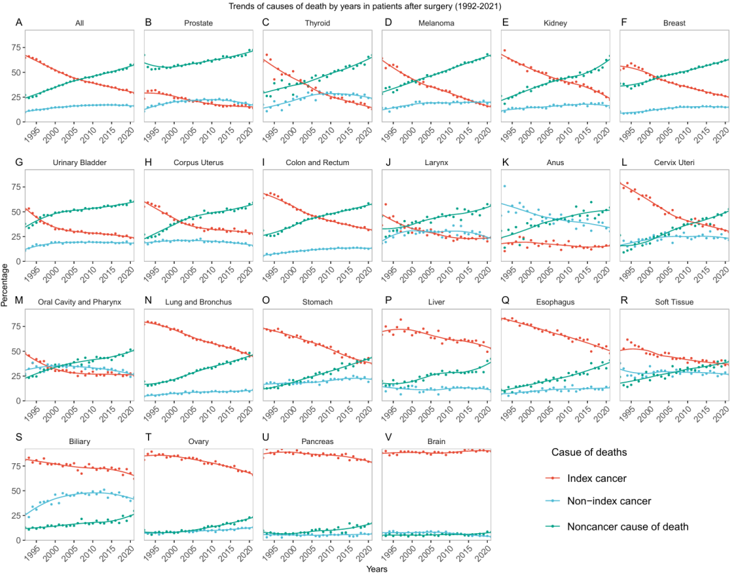 为填补这一研究空白,研究团队开展了大规模回顾性队列研究,纳入1992-2021年间美国SEER数据库中患有21种实体癌之一的342万余名患者,其中237万余名接受了手术治疗。研究采用竞争风险模型等先进统计方法,系统分析了30天及长期随访中,肿瘤相关死亡、第二原发癌死亡及非肿瘤原因死亡的累积死亡率及时间变化趋势。通过长达35年的长期分析,全面勾勒出不同癌症类型术后死亡原因的分布特征与演变规律,确保了研究结果的可靠性与代表性。