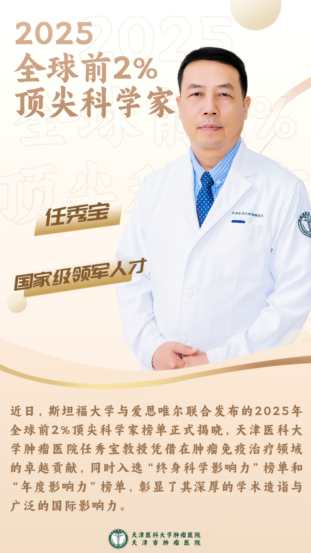 近日,斯坦福大学与爱思唯尔联合发布的2025年全球前2%顶尖科学家榜单正式揭晓,天津医科大学肿瘤医院任秀宝教授凭借在肿瘤免疫治疗领域的卓越贡献,同时入选“终身科学影响力”榜单和“年度影响力”榜单,彰显了其深厚的学术造诣与广泛的国际影响力。