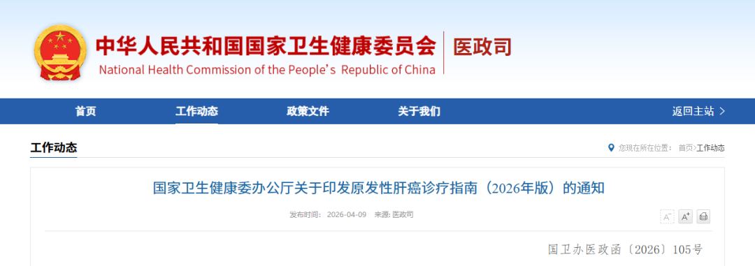 为进一步提高原发性肝癌诊疗规范化水平,保障医疗质量安全,维护患者健康权益,我委组织对《原发性肝癌诊疗指南(2024年版)》进行修订,形成了《原发性肝癌诊疗指南(2026年版)》。现印发给你们(见附件,可在国家卫生健康委网站医政司栏目下载),请各地卫生健康行政部门组织做好实施。