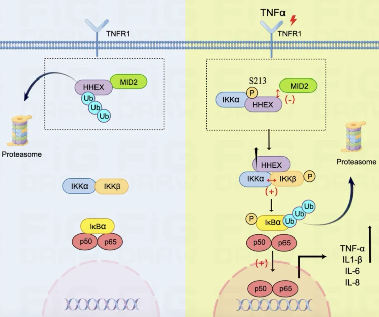 从深层机制来看,HHEX可作为支架蛋白稳定IKK复合物,进而激活NF-κB炎症通路,同时HHEX自身又会受IKKα磷酸化修饰,反过来进一步强化原有通路,最终形成恶性正反馈环路,持续推动肠道炎症恶化,这也直接解释了部分IBD患者对抗TNF药物应答不佳的根本原因。