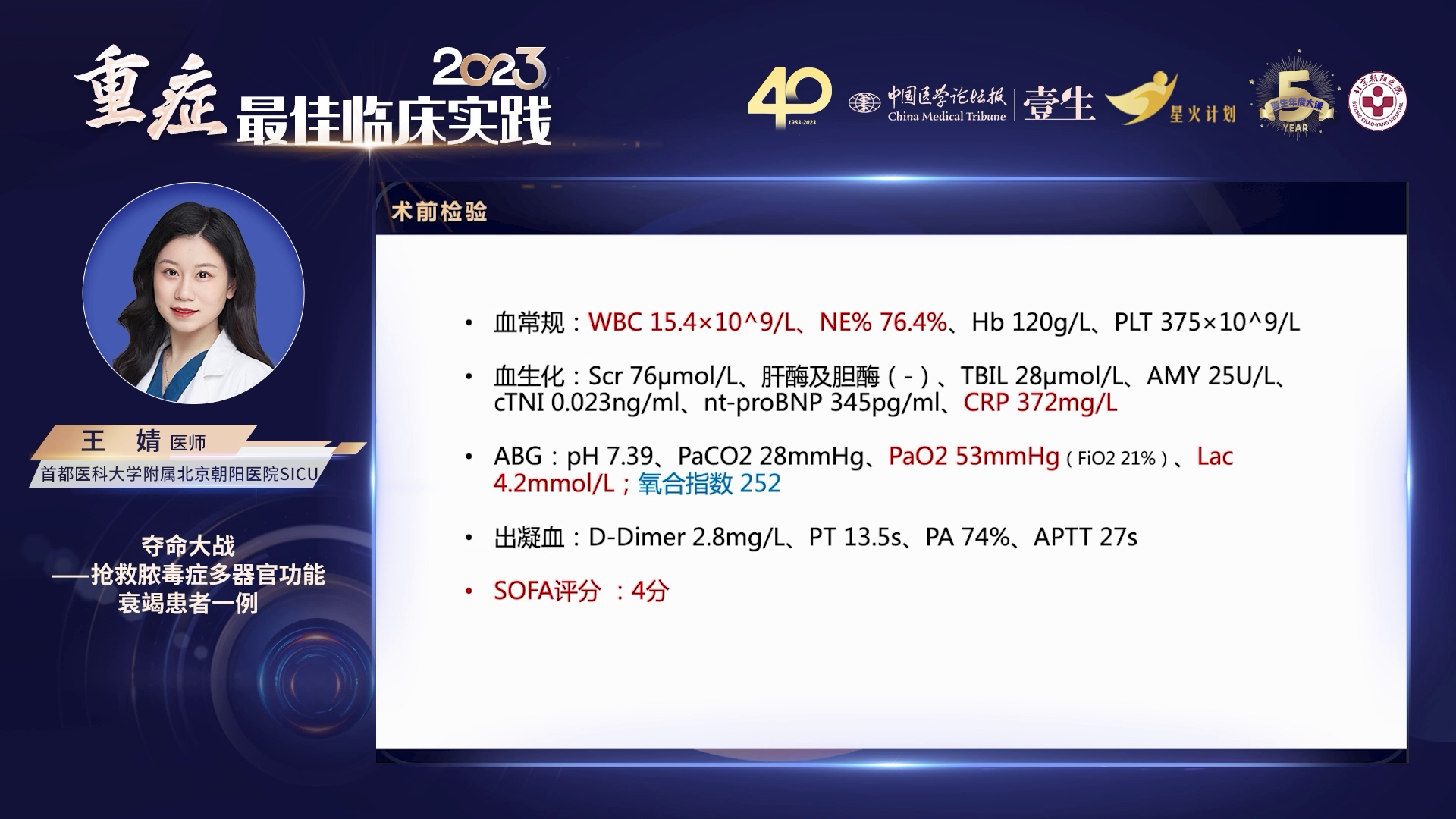 术后转入ICU,因镇静无法评估中枢神经系统,床旁超声示双肺弥漫B线,呼吸机支持条件高,PEEP 12 cmH₂O,血气分析提示重度ARDS,氧合指数71 mmHg,PaO₂ 32 mmHg,PaCO₂ 54 mmHg,乳酸升至4.9 mmol/L 。循环持续恶化,去甲肾上腺素增至1.1 μg/kg/min,SvO₂ 55%,CVP 10-11 cmH₂O。入科首次化验肌酐由76 μmol/L升至120 μmol/L,尿量维持100-180 mL/h,凝血功能开始异常,PTT显著延长,ALT降到32%,术后出现高热,体温最高39℃,中性粒细胞升高,腹腔引流液为淡黄色液体,SOFA评分升至9分。