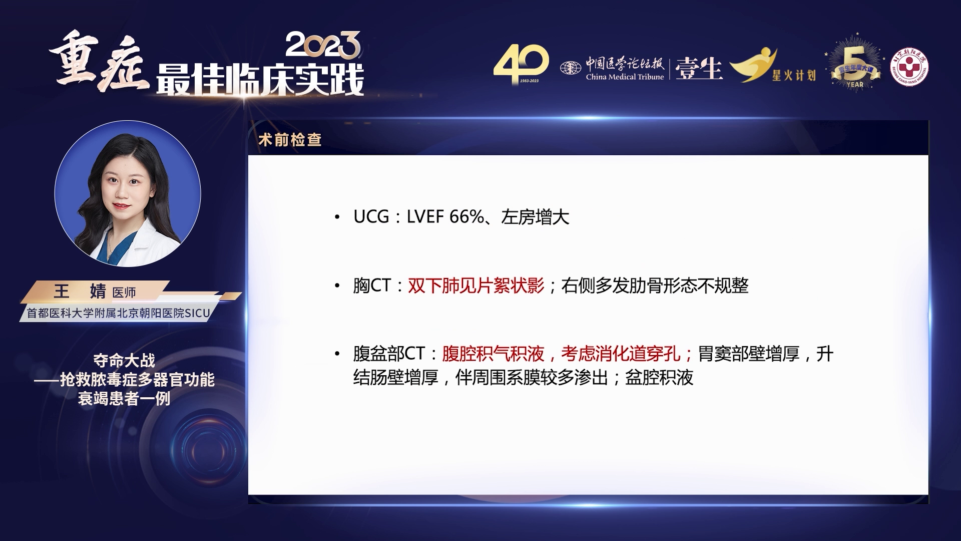 腹盆CT显示腹腔游离气体及积液,考虑消化道穿孔,升结肠壁及肠系膜多发渗出,盆腔积液。急诊行腹腔镜下肠粘连松解+胃穿孔修补术,术中见胃前壁穿孔,患者饱食后穿孔,腹腔内大量食物残渣及脓液,污染严重,脏器广泛充血水肿,表面覆大量脓苔,粘连致密。术中尽量清除食物残渣和脓液,大量生理盐水冲洗腹腔并缝合穿孔,留置引流管。但术中患者循环状态不稳定,出现严重血流动力学紊乱,去甲肾上腺素最大剂量达0.3 μg/kg/min,2小时尿量200 mL。