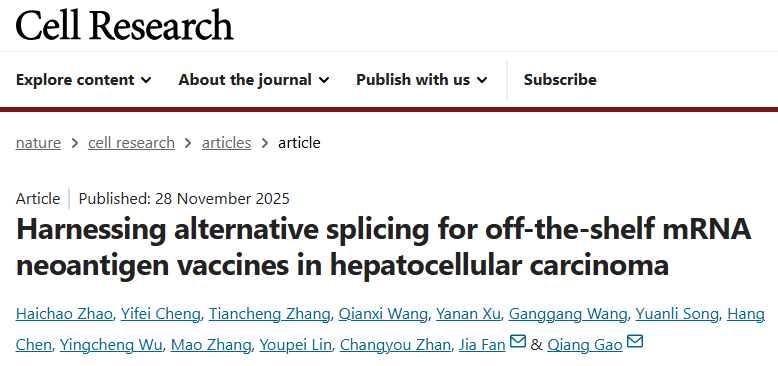 2025年11月28日,复旦大学附属中山医院樊嘉院士、高强教授团队在 Cell Research 期刊发表了题为:Harnessing alternative splicing for off-the-shelf mRNA neoantigen vaccines in hepatocellular carcinoma 的研究论文。