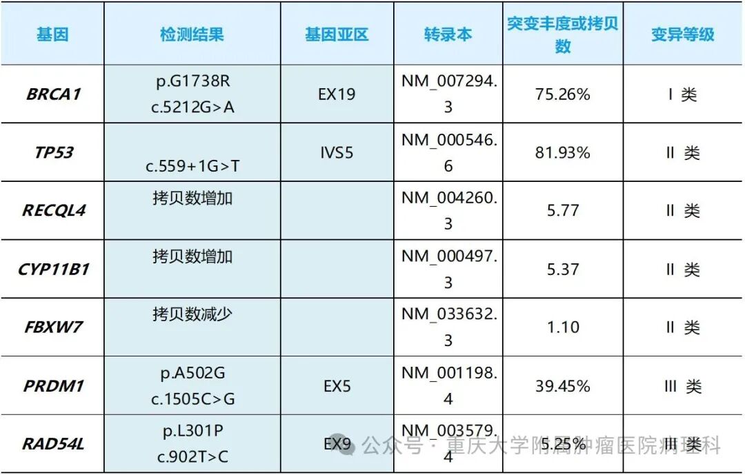 例如,BRCA1 p.G1738R c.5212G>A,表示BRCA1基因第19号外显子第1738位密码子编码的氨基酸甘氨酸突变为精氨酸。其转录本为NM_007294.3,cDNA文库的第5212为有碱基“A”置换了碱基“G”,突变丰度(频率)为75.26%。