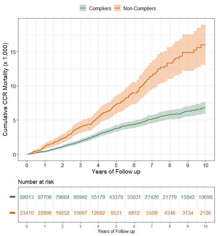 依从组CRC患者10年累积死亡率为6.8/1000,不依从组为16.0/1000,不依从组的CRC所致累积死亡率从随访初期即高于依从组,随着随访时间延长,二者差异进一步拉大。整个随访周期中,不依从组的CRC累积死亡率比依从组高出103%!