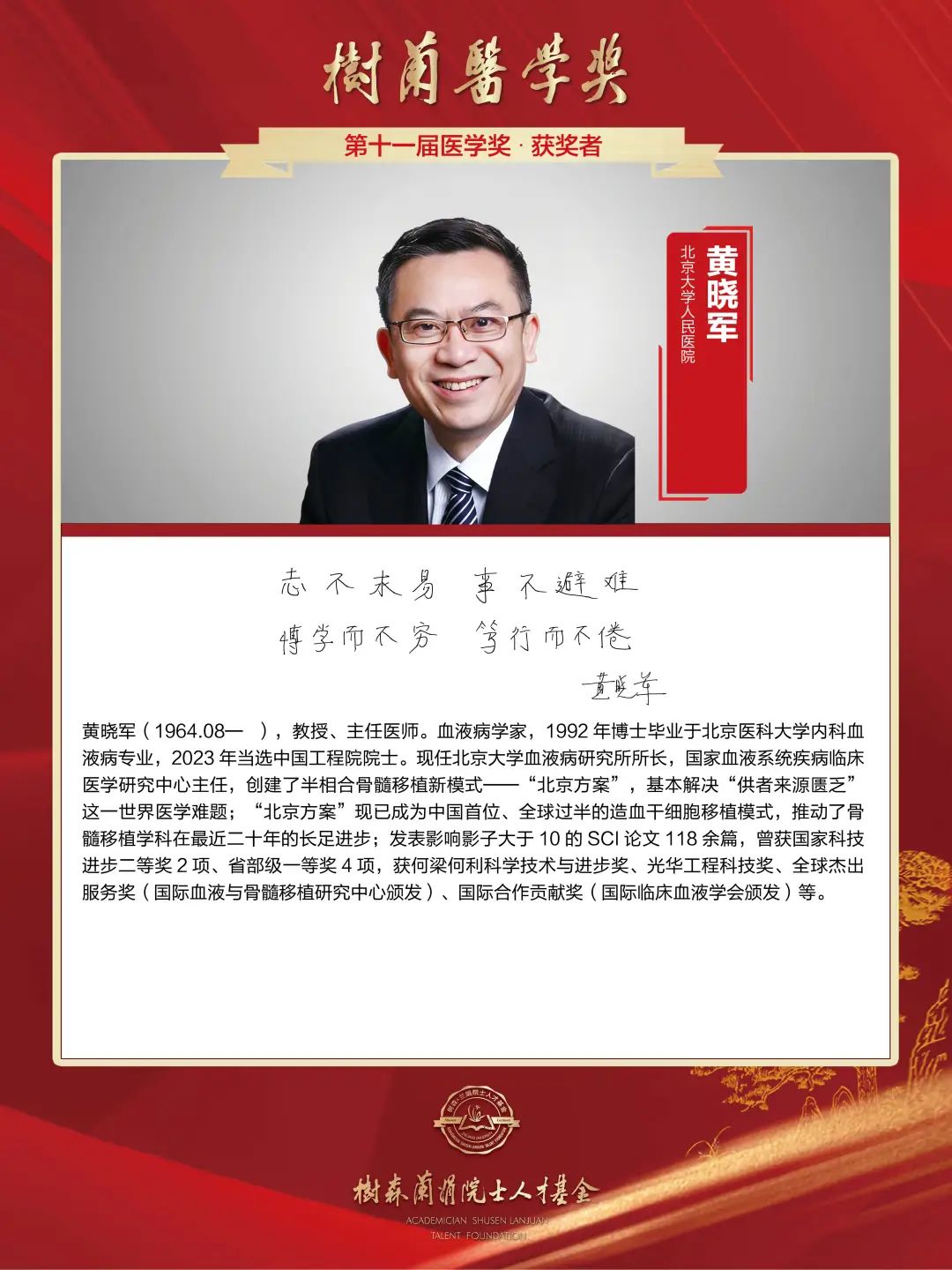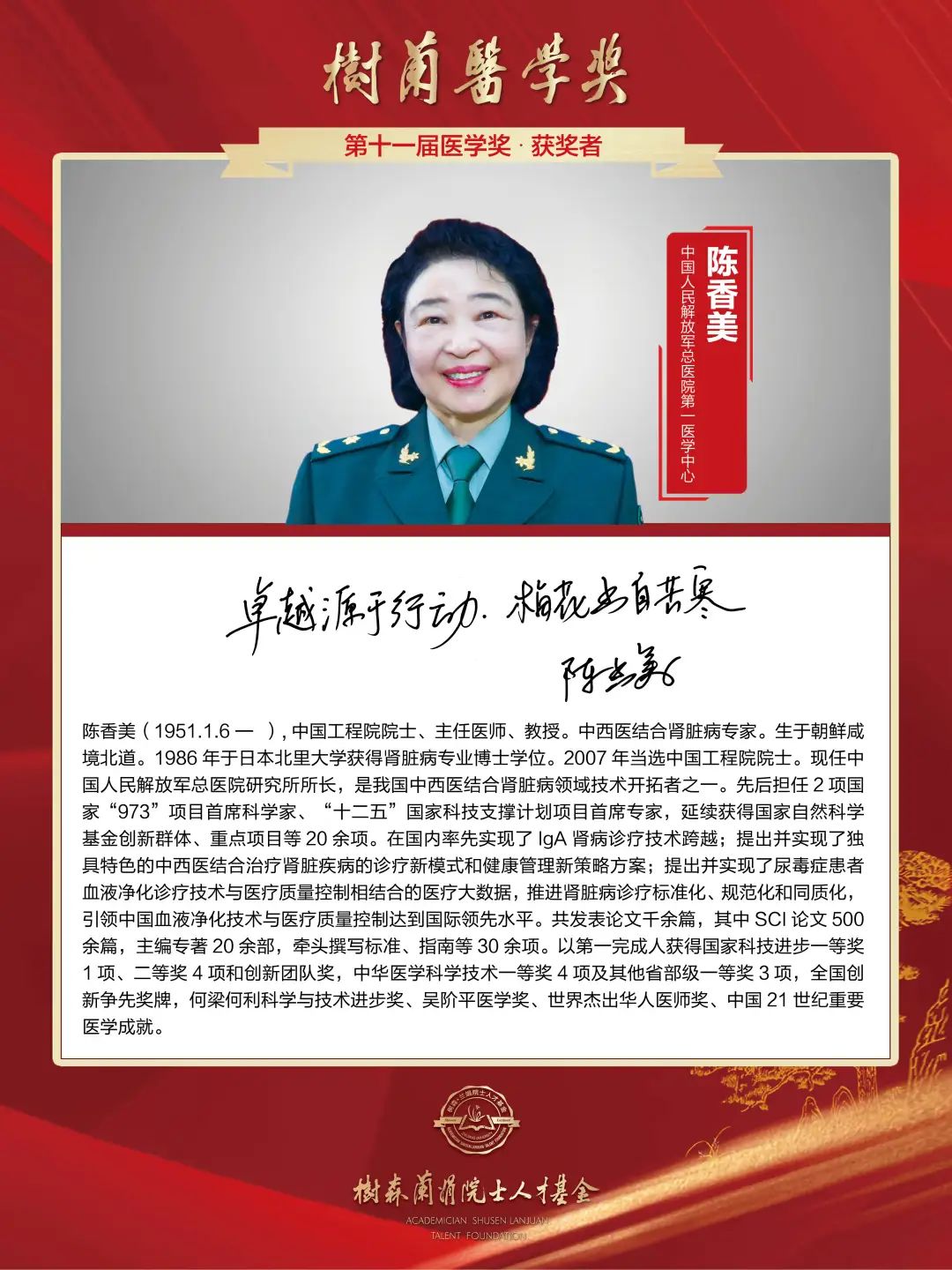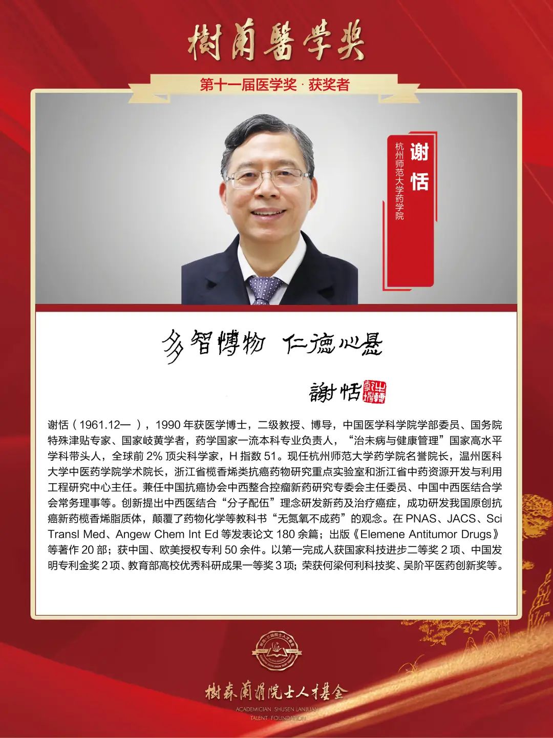 2024年12月7日,第十一届“树兰医学奖”颁奖盛典在横琴拉开帷幕,陈香美院士、黄晓军院士、谢恬教授荣获“树兰医学奖”。赵涵、迟象阳、周陈晨、凡进、朱书、伊成器、杨鹏飞、路志红、郁金泰、李华兵、刘强、高栋、梁广、刘玥、李怡芳共15位青年医学科学家摘取“树兰医学青年奖”桂冠。十三届全国人大常委会副委员长、四大慢病重大专项技术总师陈竺院士,树兰基金会理事长郑树森院士和李兰娟院士莅临指导并向获奖者颁发证书、奖杯、铭牌。