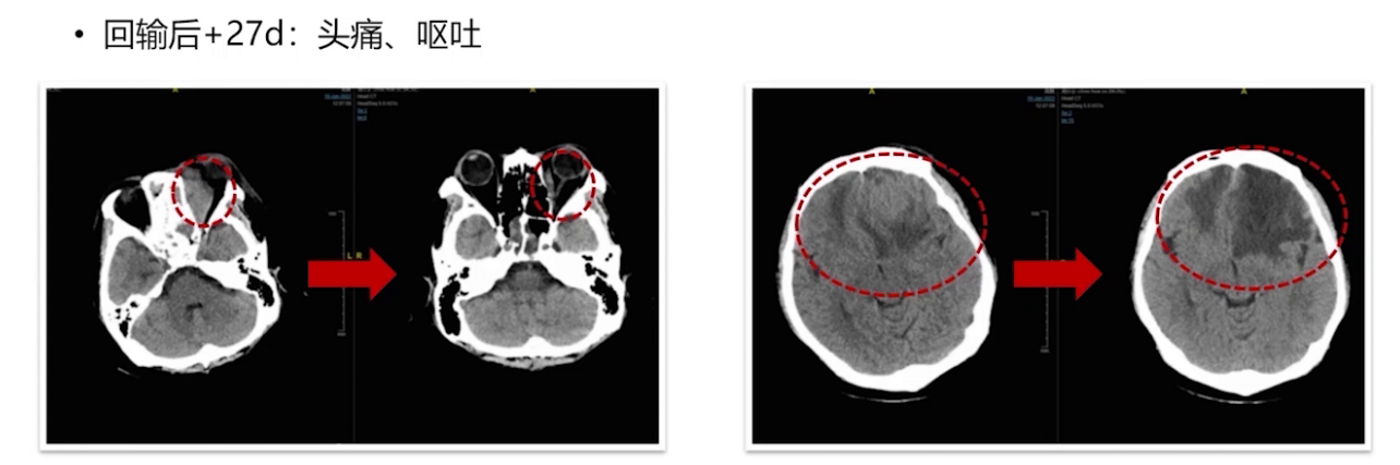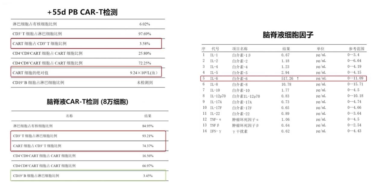 2021年12月21日进行CAR-T细胞单采,22日开始桥接治疗(MTX联合BTK抑制剂),2022年1月7日进行FC预处理化疗,1月12日回输CAR-T细胞。治疗后出现发热CRS 2级反应、意识障碍,GCS评分最低达3分,CRS分级2-3级。经综合治疗,症状逐渐缓解。然而,后续患者多次出现中枢症状反复,影像学检查提示疾病进展。