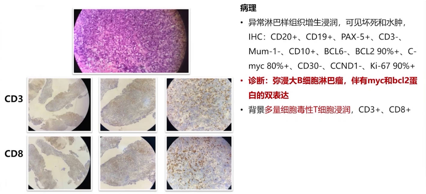 病情进展后转至本科室,再次活检及FISH检测,最终病理显示为高级别B细胞双打击。给予R-EPOCH方案联合腰穿鞘注两个周期,疾病控制不佳。