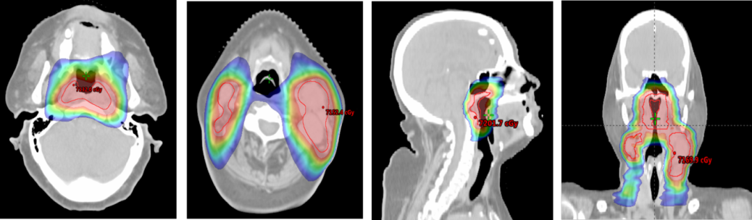 GTVp68Gy/31F,GTVnd-L 68Gy/31F, GTVnd-R 66Gy/31F,PTV1 61Gy/31F,PTV2 55Gy/31F。因淋巴结消退明显,10次后重新再定位,15次后以新计划继续放疗。放疗过程中出现2级放射性咽喉炎、放射性皮炎。