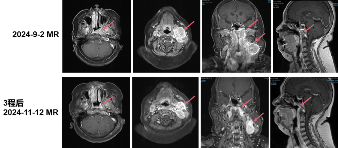 本病例展示了一例Ⅲ期鼻咽癌患者的临床治疗过程与转归。患者初始接受三周期“白蛋白紫杉醇+顺铂+特瑞普利单抗”方案治疗,后续影像学评估显示,原发灶虽有一定程度缩小,但“右侧咽后间隙淋巴结较前新发,双颈淋巴结多数较前增大(除左侧Ⅱ区较大淋巴结外)”。这提示PD-1抑制剂联合化疗方案未能有效控制疾病进展,临床需迅速调整治疗策略。